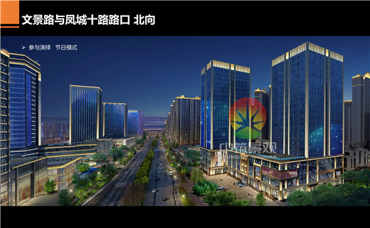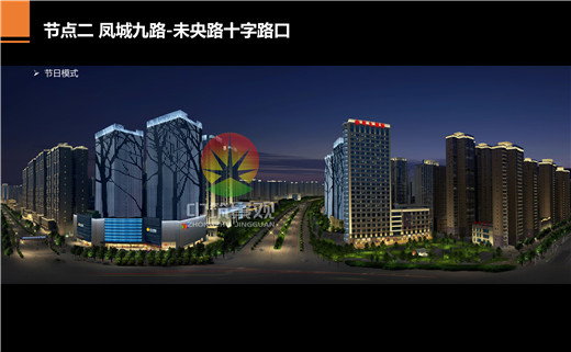 (鳳城九路-未央路十字路口)統(tǒng)一夜景燈光色調(diào),洗亮建筑頂部天際線,突顯建筑風(fēng)格并充分表現(xiàn)建筑的細(xì)節(jié)和特點(diǎn),節(jié)日模式增加異形設(shè)計(jì),增加燈光層次感。
