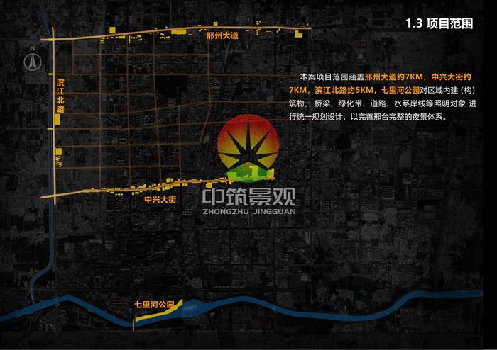 本案項目范圍涵蓋邢州大道(宜居生活景觀軸)約7KM,中興大街(城市形象商旅軸)約7KM,濱江北路(邊界風貌景觀帶)約5KM,七里河公園(生態休閑景觀帶)對區域內建(構)筑物、 橋梁、綠化帶、道路、水系岸線等照明對象 進行統一規劃設計,以完善邢臺完整的夜景體系。