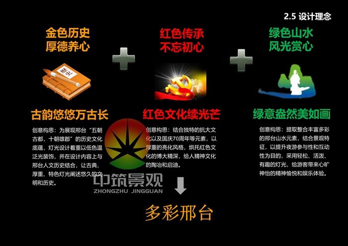 設計理念:金色歷史 厚德養心;紅色傳承 不忘初心;綠色山水風光賞心。