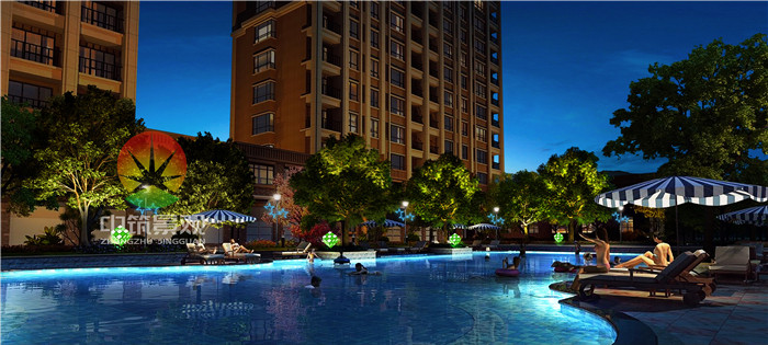 沿游泳池周邊輪廓照亮 ,為小區業主營造良好夜間游泳環境,綠植照明搭配庭院燈,點綴魔方燈光小品 ,整體畫面溫馨舒適 。